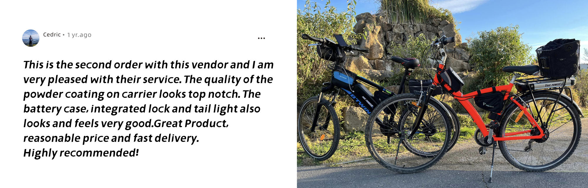 Product worked perfectly for my e-bike, as advertised. They were nearly out of stock but worked with me to get one sent quickly. Greatly appreciated. Now I need to buy a second one.