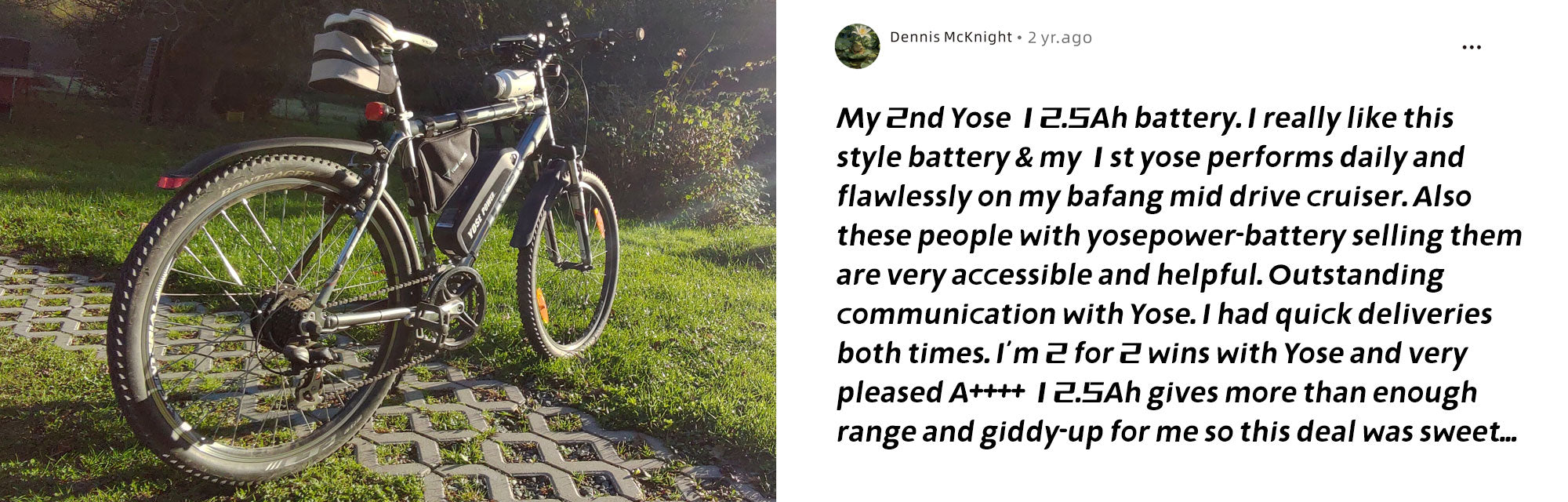 Customer service responded to my questions so I would be sure to get the correct replacement battery. I ordered it and it arrived within a week. It is cold in Minnesota so I was only able to test if for 15 miles but it had all of the power of the original battery. I am very satisfied and the price was much less than ordering it through the bicycle vendor.